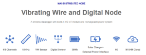 Battery Life | Without solar panel charging:10 days (@sampling peroid of 30min with 4*inclinometers, 4*vibrating wires sensors) | |