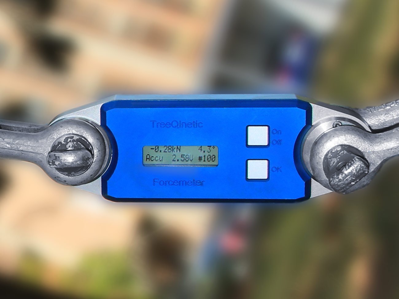 TreeQinetic Forcemeter mengukur gaya yang diberikan ke pohon melalui tali selama uji tarik. Untuk penanganan yang lebih baik, busur derajat terintegrasi untuk merekam sudut tali saat ditarik.