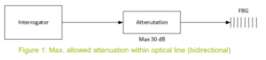 2. Redaman maksimum yang dapat dimasukkan dalam jalur optik antara interrogator dan FBG yang diukur (atau serangkaian FBG dengan tingkat daya yang sama). (Lihat Figure 1 di bawah)
