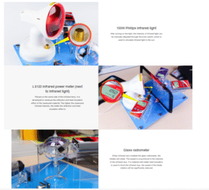 The window film sales kit is equipped with ultraviolet flashlights and authentic Philips infrared lamps with adjustable light intensity, thus to simulate infrared and ultraviolet rays in outdoor sunlight respectively. The instrument is also equipped with a plexiglass booth and a special aluminum box for easy installation and packaging.
