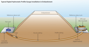 Pengukur Profil Hidrostatik Digital diposisikan pada blok beton atau pin datum referensi.
