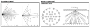 - Lensa standar memiliki potensi sudut pandang 120° tetapi jangkauan berkurang menjadi ~2 m di luar 80°.
