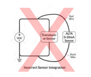 Dalam loop daya, terminal positif dari sumber daya DC terhubung ke terminal positif transduser arus dan terminal negatif transduser terhubung ke terminal negatif dari sumber daya DC. Dalam loop pengukuran, output sinyal milliamp transduser terhubung ke kawat MERAH dari Sensor ALTA. Kawat HITAM dari Sensor ALTA terhubung kembali ke terminal negatif dari sumber daya DC.
