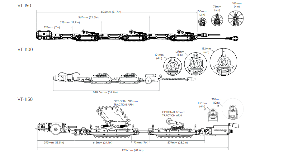 Crawler VersaTrax I-Series dirancang untuk menjelajah jarak jauh pada pipa berdiameter kecil hingga menengah. Sistem ini dapat memasuki bukaan sekecil 51 mm (2 in) hingga 305 mm (12 in).